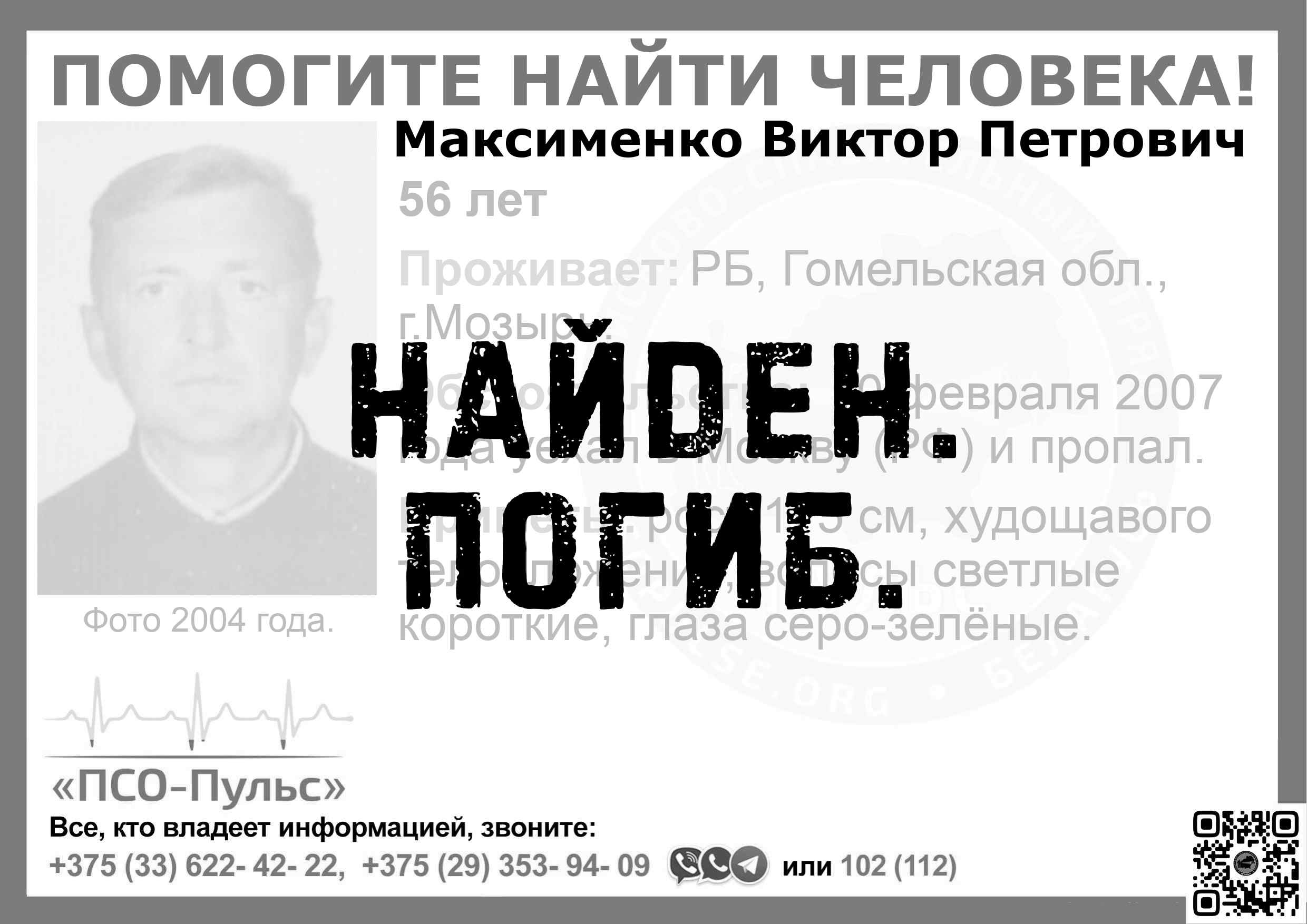 Всех, кто владеет информацией, просим сообщить: ПСО "ПСО-Пульс" +375(33)622-4222 |