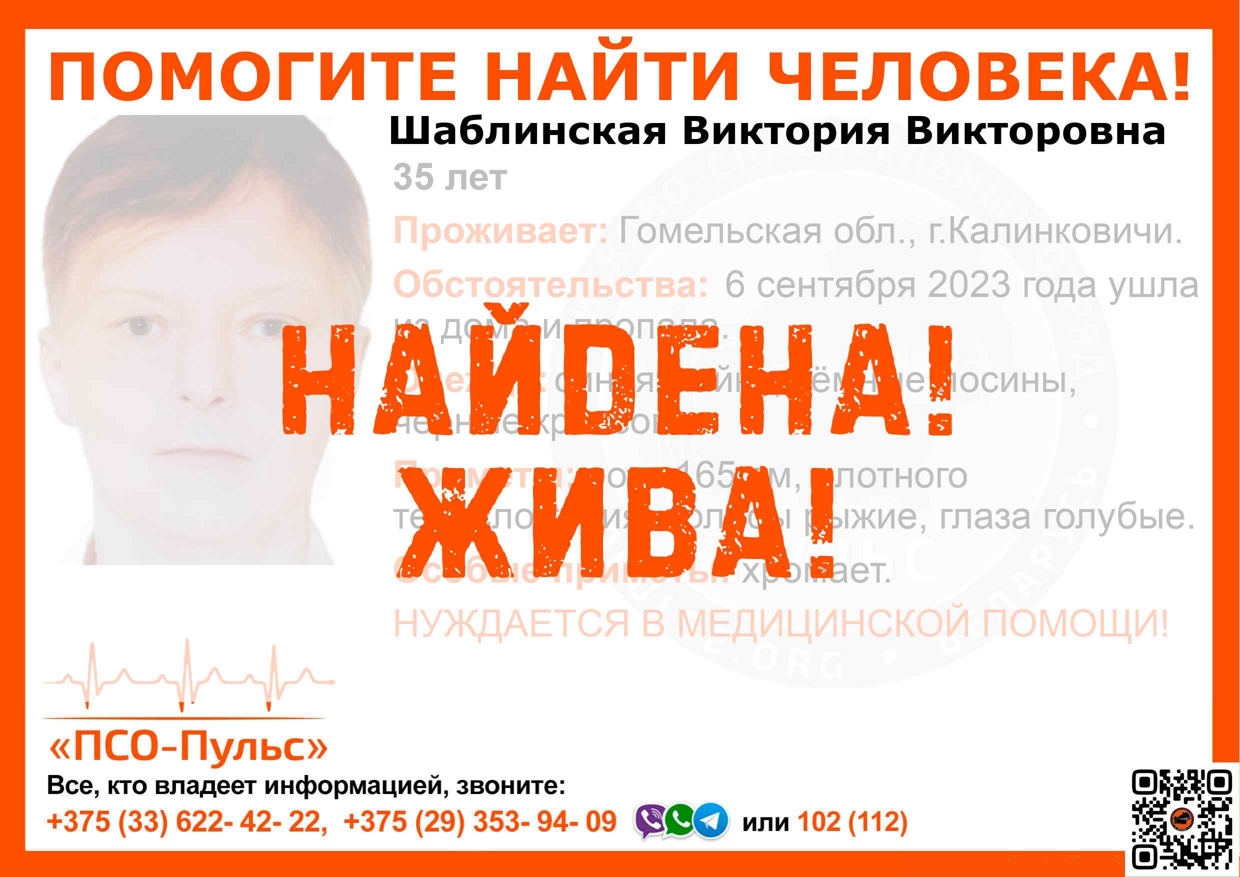 Скачать ориентировкуДля оперативного получения информации о пропавших людях и сборах на поиски можно подписаться на бота оповещения: Телеграм