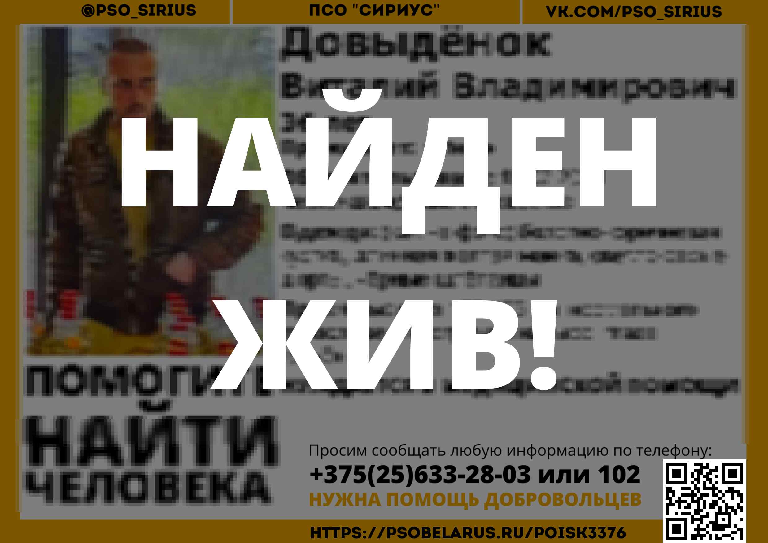 Всех, кто владеет информацией, просим сообщить: ПСО "Сириус" +375(25)633-28-03 |