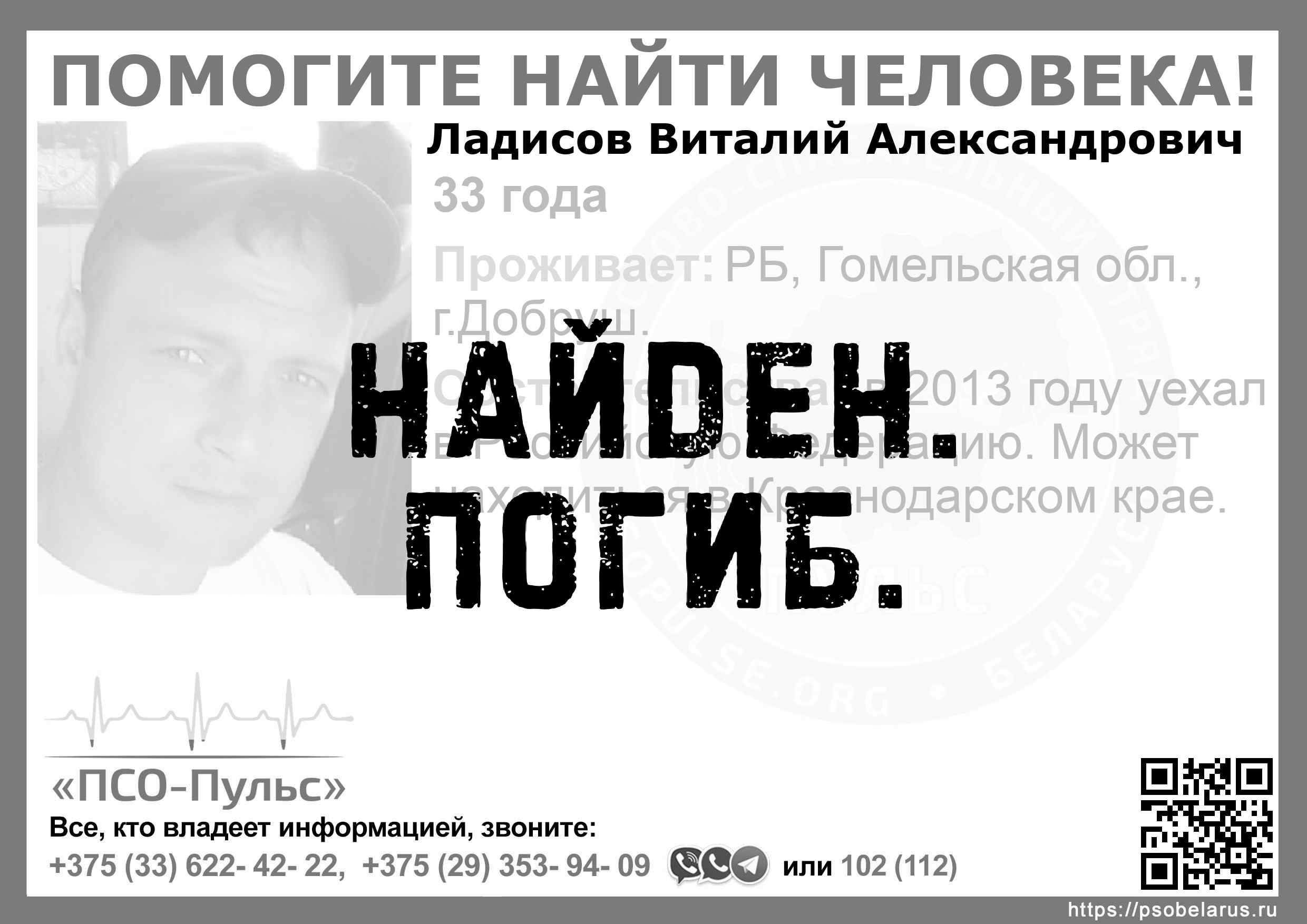 Всех, кто владеет информацией, просим сообщить: ПСО "ПСО-Пульс" +375(33)622-4222 |