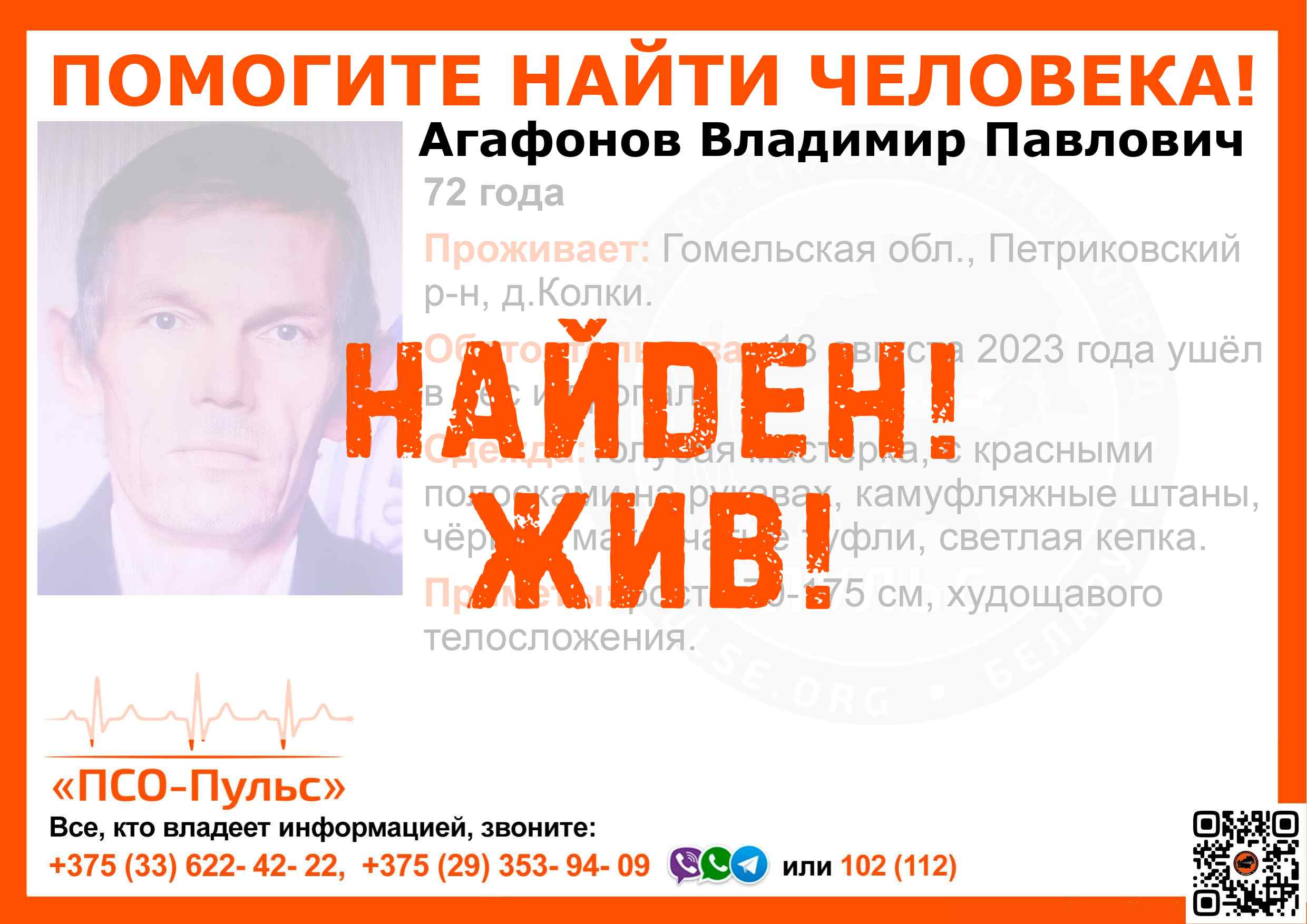Всех, кто владеет информацией, просим сообщить: ПСО "ПСО-Пульс" +375(33)622-4222 |