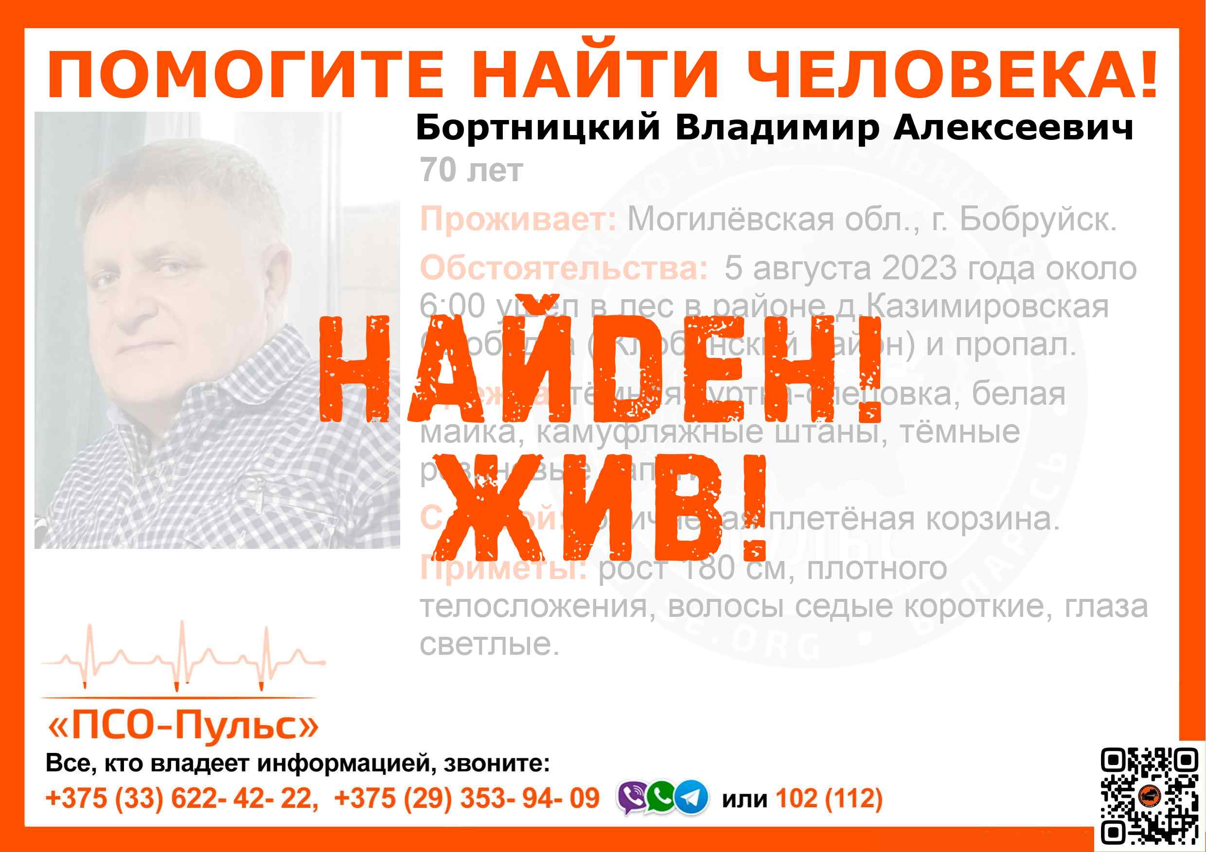 Всех, кто владеет информацией, просим сообщить: ПСО "ПСО-Пульс" +375(33)622-4222 |