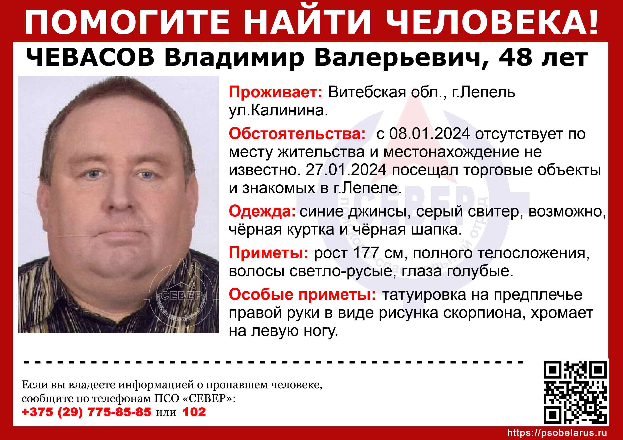 Всех, кто владеет информацией, просим сообщить: ПСО "СЕВЕР" +375(29)775-8585 |