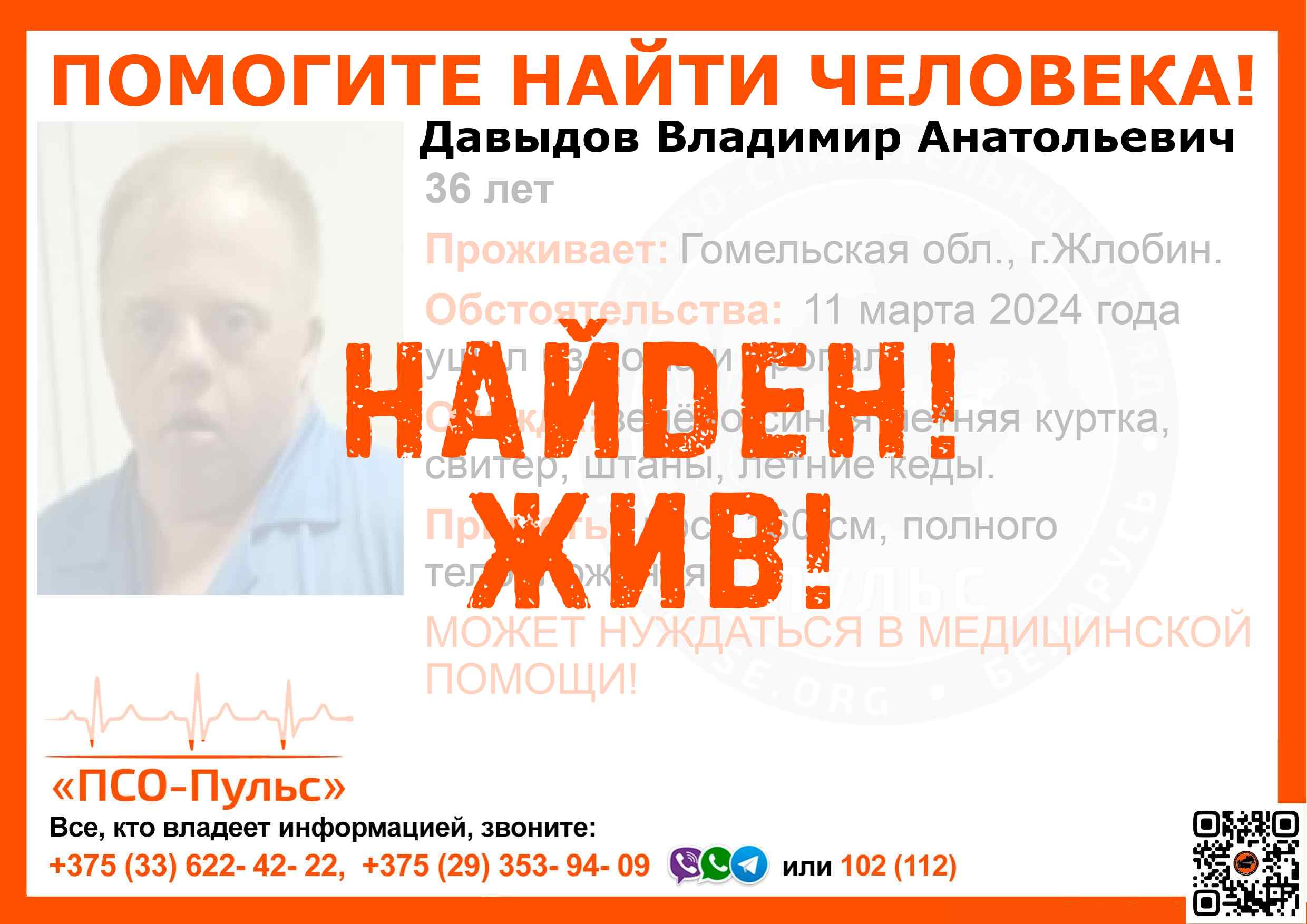 Всех, кто владеет информацией, просим сообщить: ПСО "ПСО-Пульс" +375(33)622-4222 |