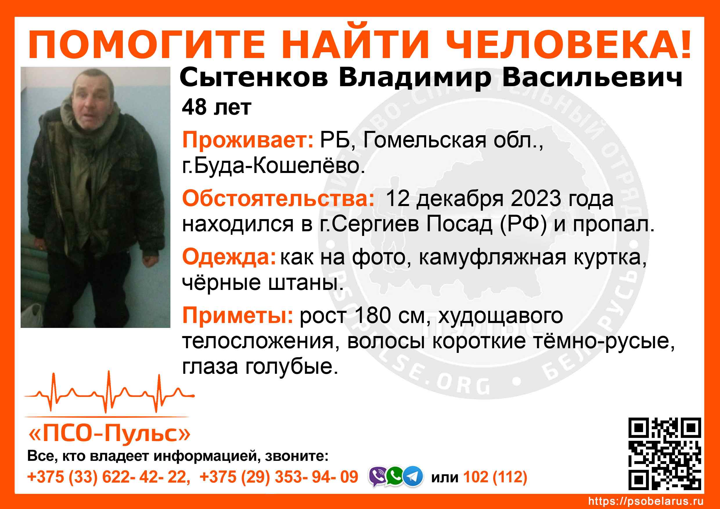 Всех, кто владеет информацией, просим сообщить: ПСО "ПСО-Пульс" +375(33)622-4222 |