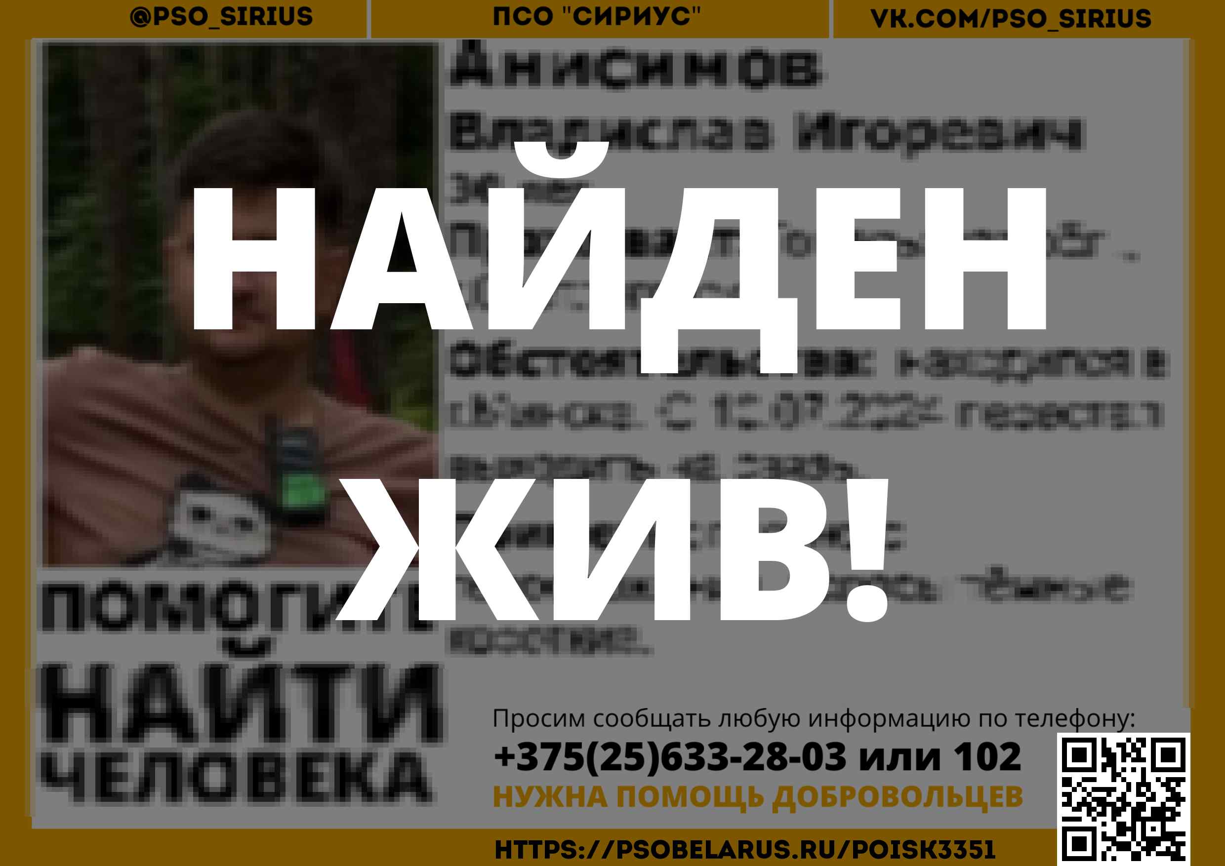 Всех, кто владеет информацией, просим сообщить: ПСО "Сириус" +375(25)633-28-03 |