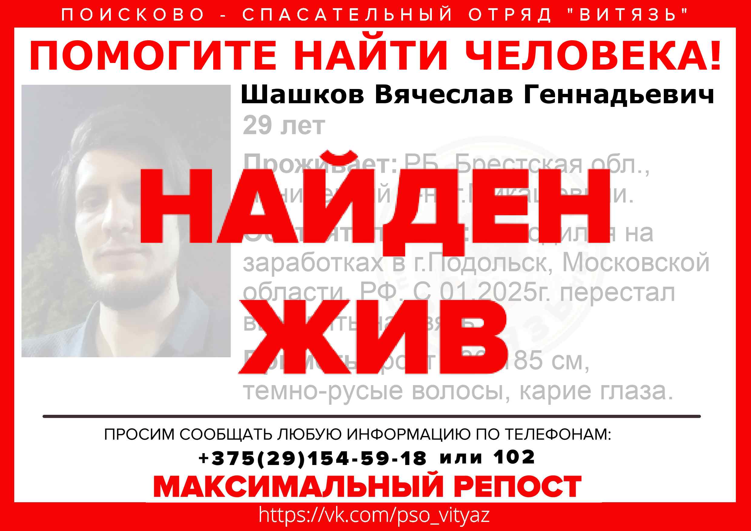 Всех, кто владеет информацией, просим сообщить: ПСО "ВИТЯЗЬ" +375(29)154-59-18 |